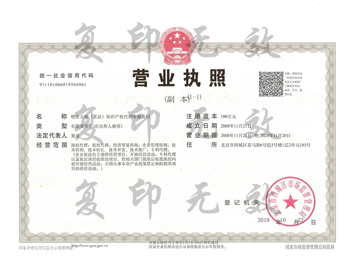 橙庆天和(北京)知识产权代理有限公司,成立于2012年6月,是一家新兴的以知识产权为主营业务的综合投资公司。本企业的宗旨是为企业知识产权的完善提供完美的解决方案,凭借庞大的人脉资源,特殊的社会资源及优越的政府资源为企业提供优良的服务。为企业保护自主品牌提高品牌知名度,节约生产成本,降低销售成本,为企业实现利润最大化提供帮助。